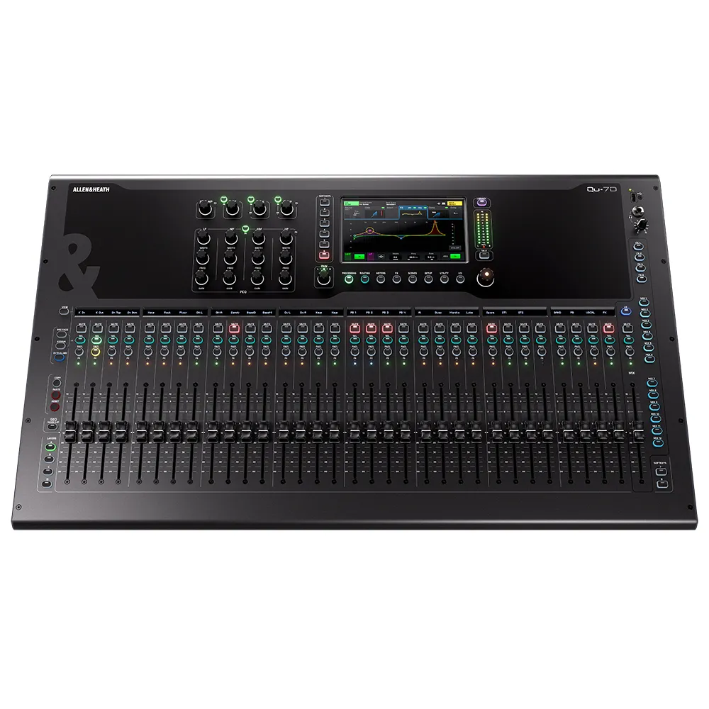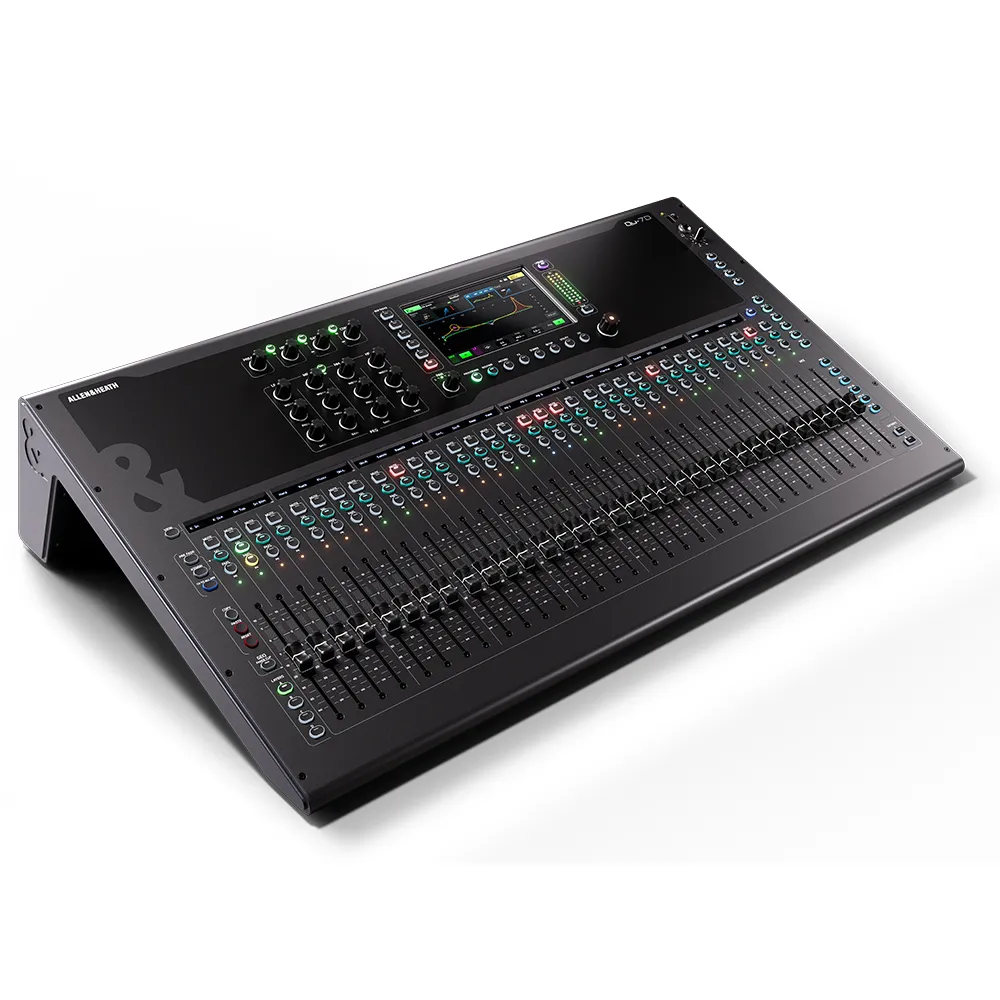 La superficie de control es vasta, con 33 faders motorizados de 100 mm, ideales para gestionar simultáneamente los 32 canales de entrada y las mezclas de salida. Combinado con una pantalla táctil de 7 pulgadas y 4 capas totalmente personalizables, el flujo de trabajo es intuitivo y extremadamente rápido. Esta respuesta táctil y visual es clave para ingenieros de sonido que necesitan reaccionar de inmediato a los cambios en el escenario o en la música en vivo.